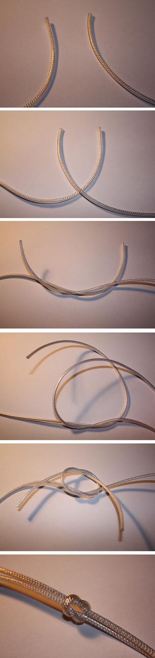 Postup: Drž oba konce a postupem "pravý přes levý" udělej uzel. Teď udělej další uzel postupem "levý přes pravý".